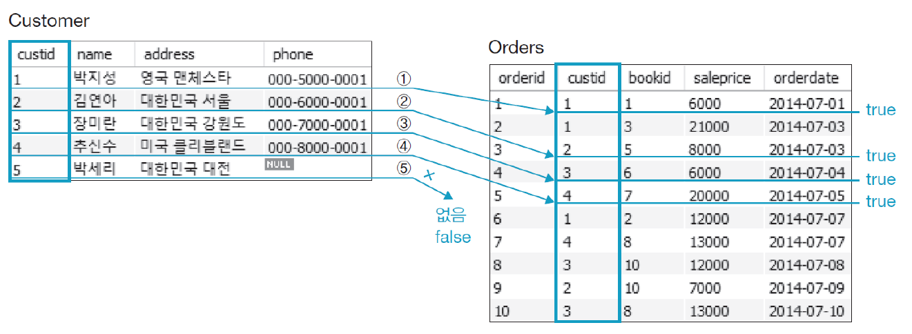 EXISTS (SELECT 명령)EXISTS는 원래 단어에서 의미하는 것과 같이 조건에 맞는 튜플이 존재하면 결과에 포함시킨다.어떤 행이 조건에 만족하면 참임NOT EXISTS는 서브쿼리의 모든 행이 조건에 만족하지 않을 때만 참임SELECT name, address FROM customer WHERE EXISTS (SELECT * -- 서브쿼리 안에 있다 없다 FROM orders WHERE customer.custid = orders.custid); -- 존재 여부는 custid로 찾겠다. -- 반환되는 행이 없으면 거짓!![]()