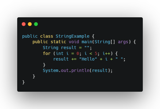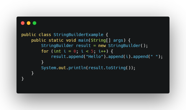 2. result.append("Hello").append(i).append(" ");는 기존 버퍼에 문자열을 추가합니다.