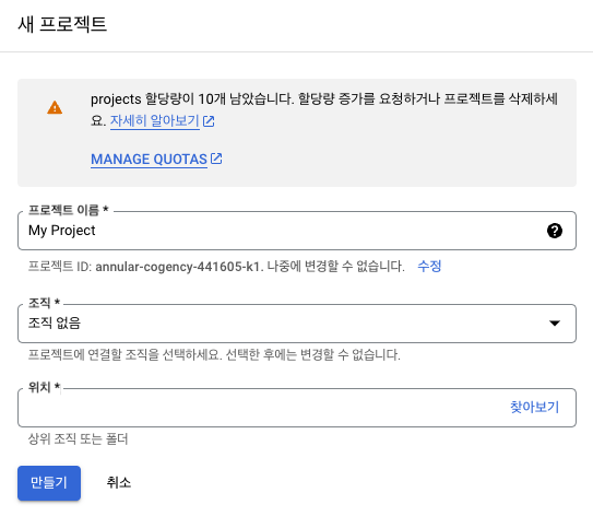 프로젝트 이름, 조직, 위치 등의 정보를 입력하고 만들기 버튼을 클릭하여 프로젝트를 생성한다.