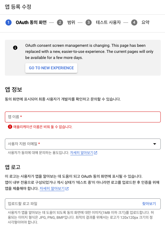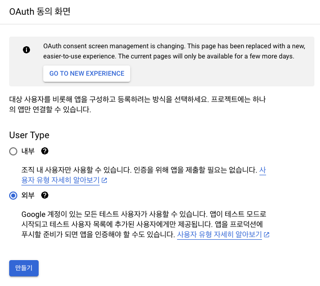 OAuth 클라이언트 ID 생성을 위해 OAuth 동의 화면 구성이 필요하다.