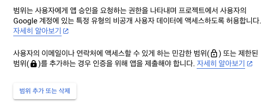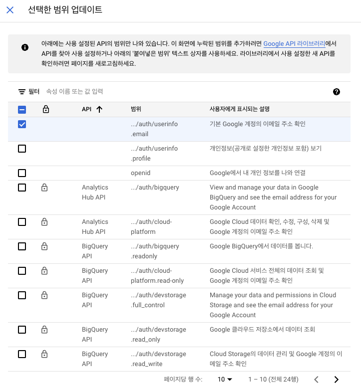 범위 추가 또는 삭제에서 ‘기본 Google 계정의 이메일 주소 확인’ 만 선택한다.