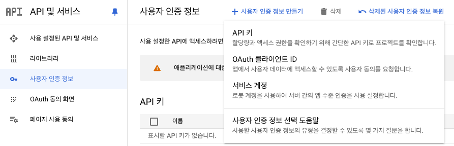 왼쪽 사이드바에서 API 및 서비스 > 사용자 인증 정보로 이동한다.