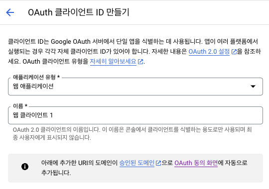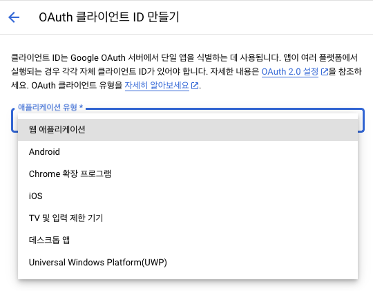 OAuth 클라이언트 ID 만들기로 돌아와 애플리케이션 유형을 선택한다.