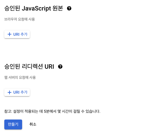 승인된 JavaScript 원본, 승인된 리디렉션 URI를 입력한다.