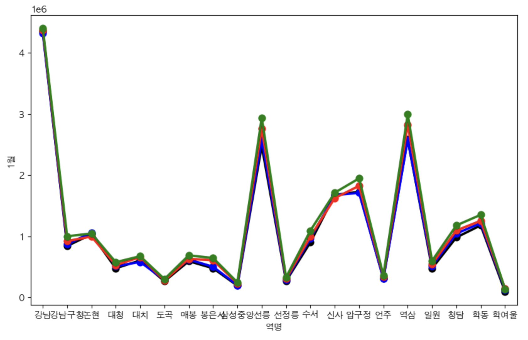 # 강남구 내에서의 지하철역별 1월,4월,8월,11월 승하차인원 비교