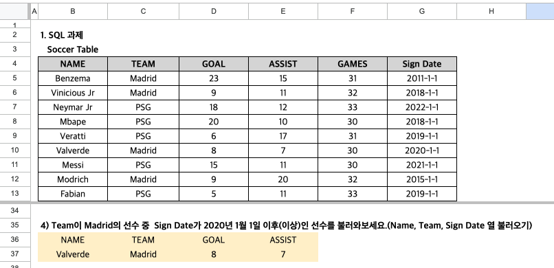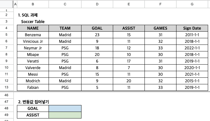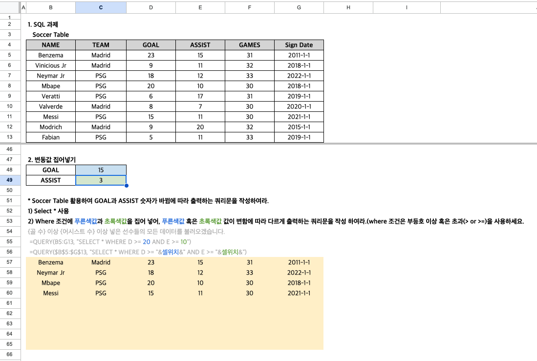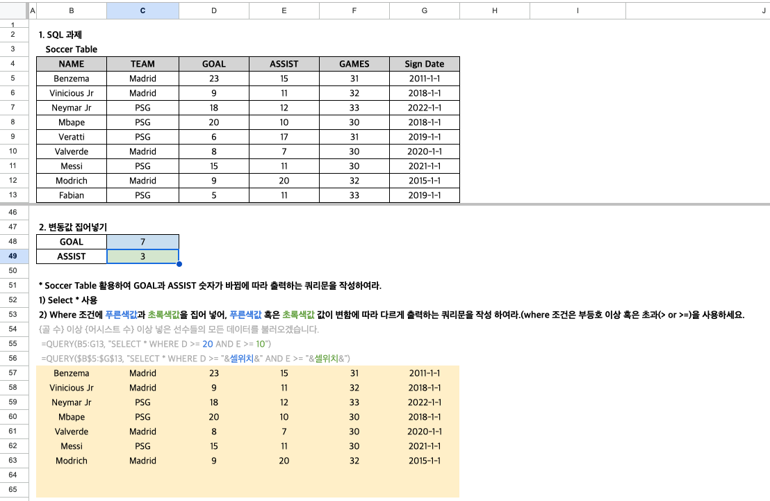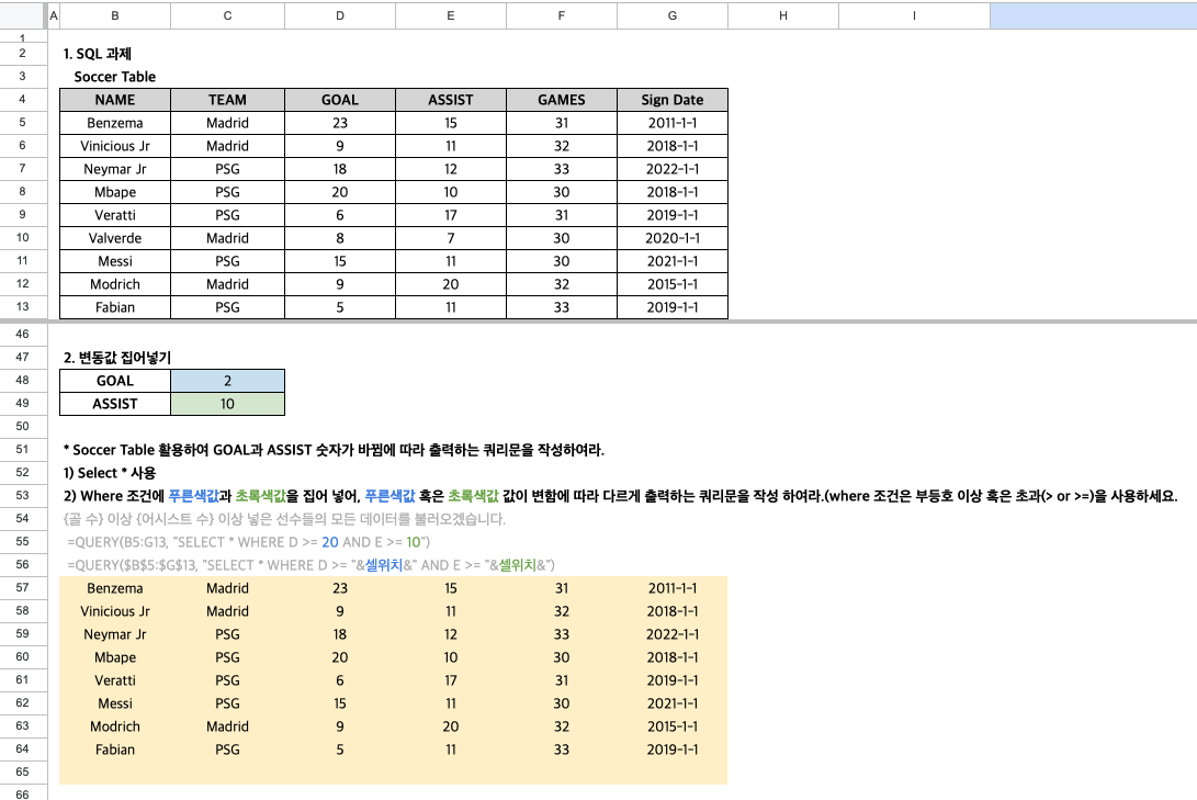 골 수와 어시스트 수를 n값으로 입력하면 해당되는 데이터를 불러오는 쿼리를 작성하겠습니다.