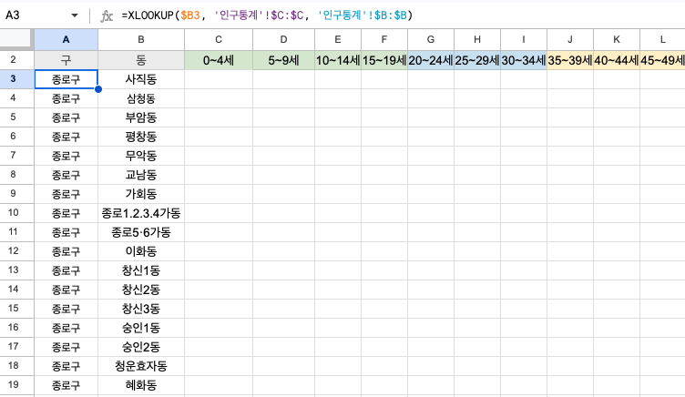 =XLOOKUP($B3, '인구통계'!$C:$C, '인구통계'!$B:$B)