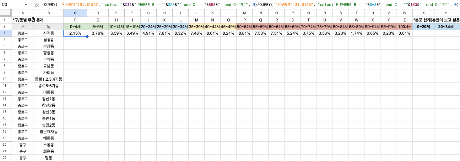 =QUERY( '인구통계'!$1:$1357, "select "&C$1&" WHERE B = '"&$A3&"' and C = '"&$B3&"' and D='계'", 0)/QUERY( '인구통계'!$1:$1357, "select E WHERE B = '"&$A3&"' and C = '"&$B3&"' and D='계'", 0)