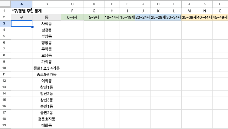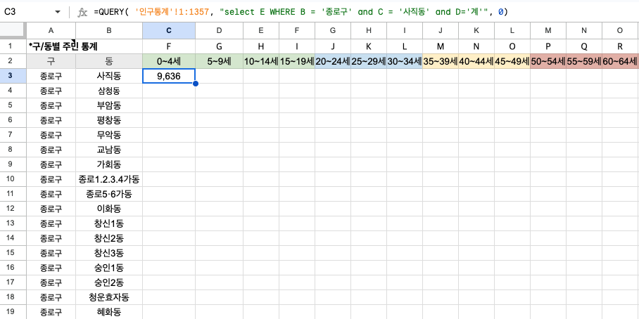 =QUERY( 전체범위, "select 0~4세 WHERE 자치구 = 종로구 and 동 = 사직동 and 구분='계'", 헤더미포함)