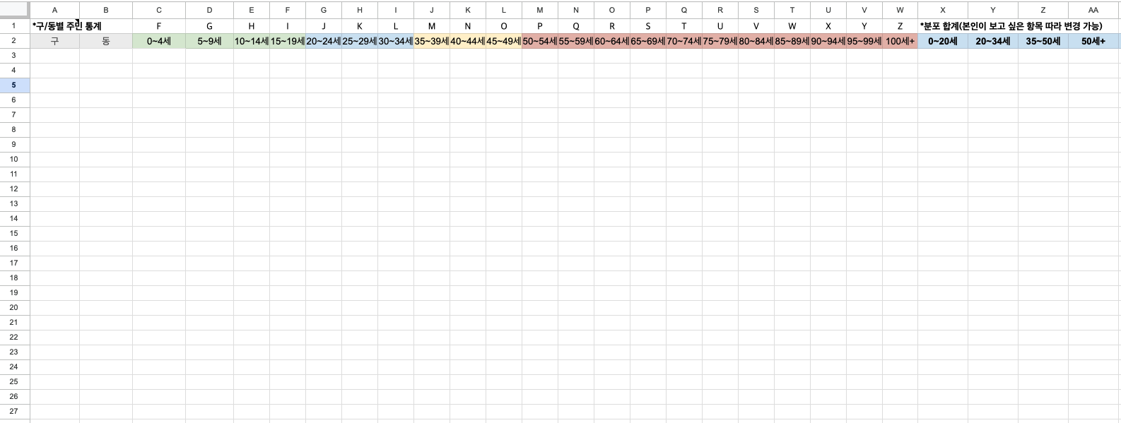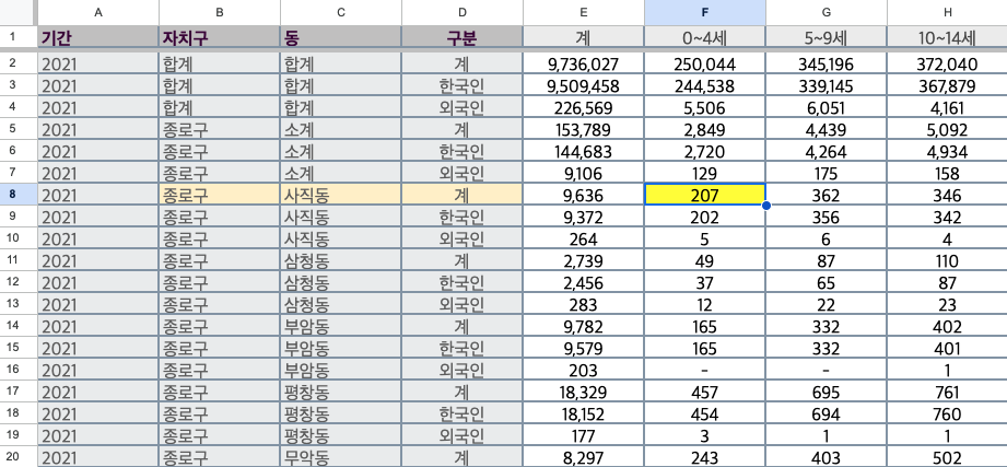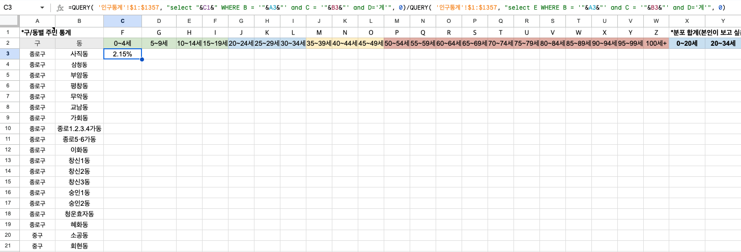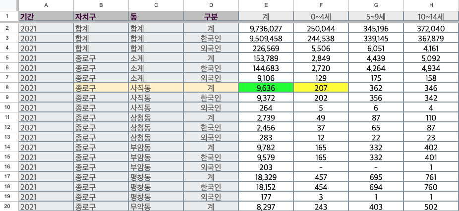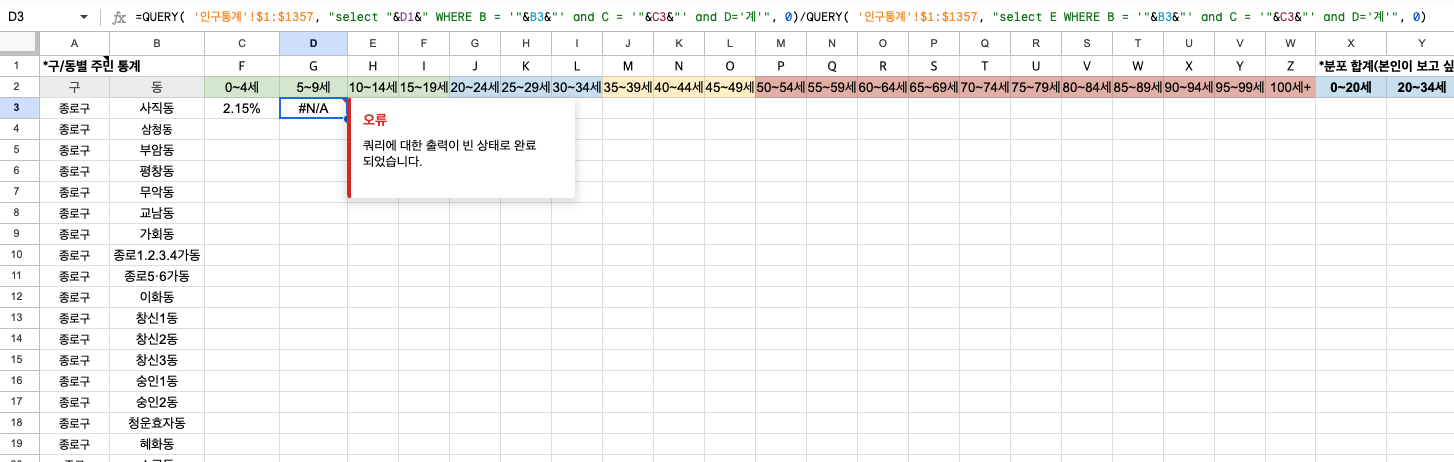=QUERY( 전체범위, "select 계E열 WHERE 자치구B열 = 종로구 and 동C열 = 사직동 and 구분D열 ='계'", 헤더미포함)