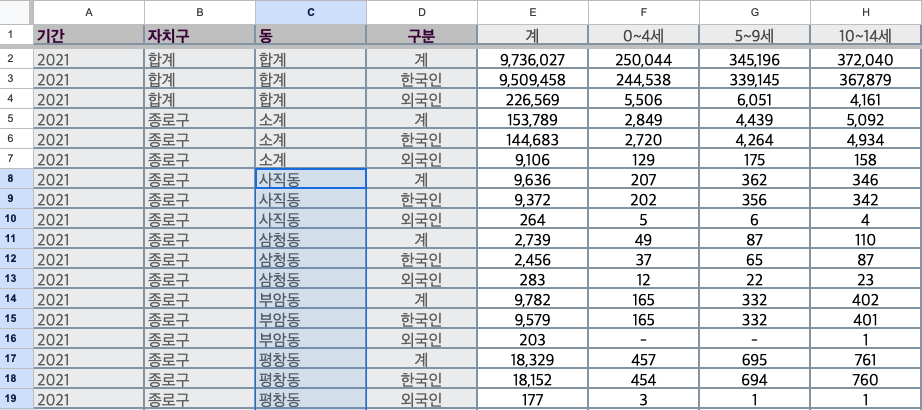 # 순서2 : header 에 속하는 동, 합계, 소계 제외하고 추출