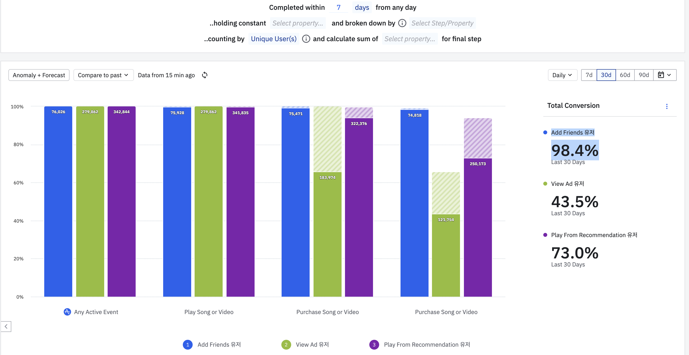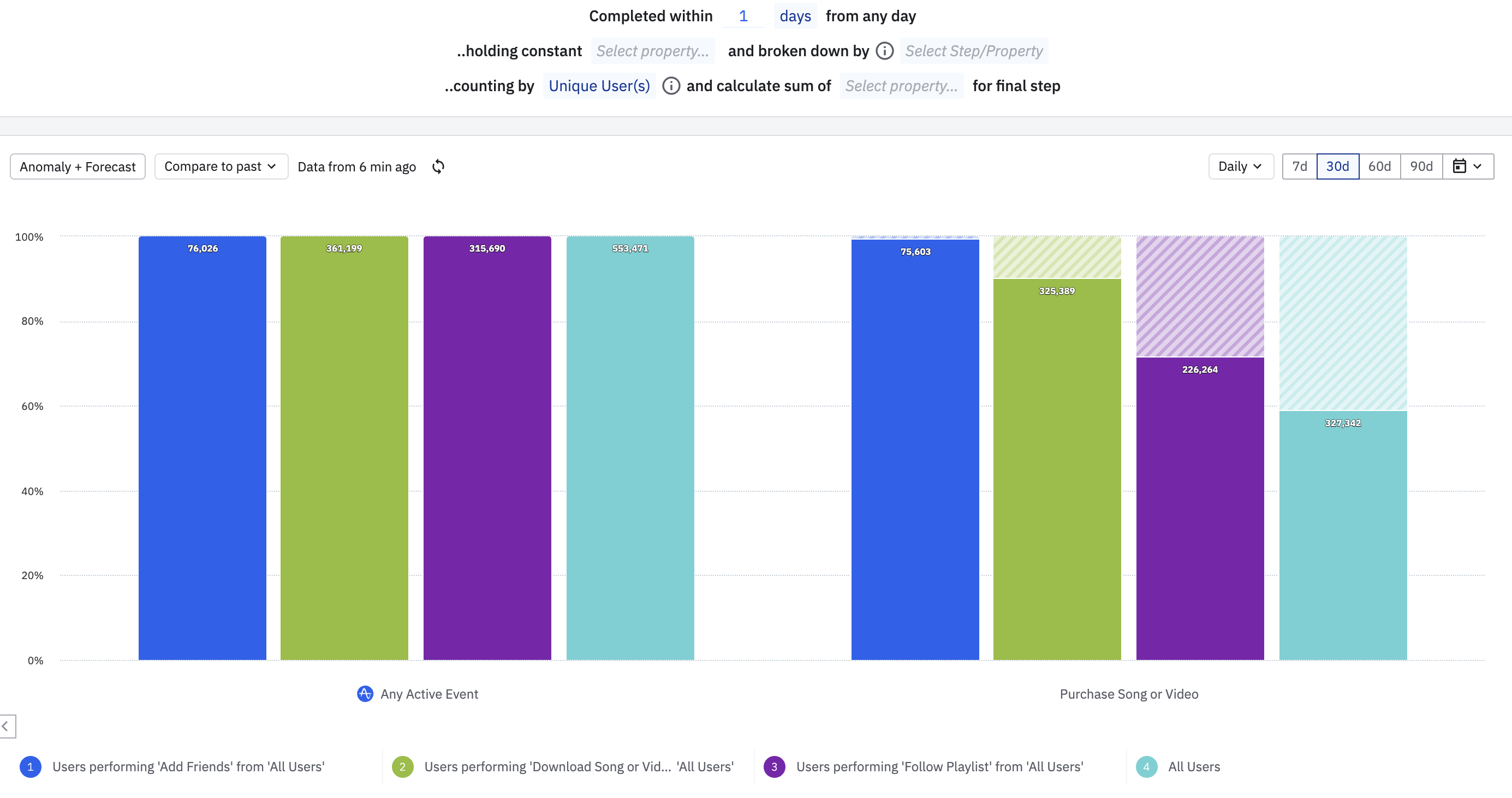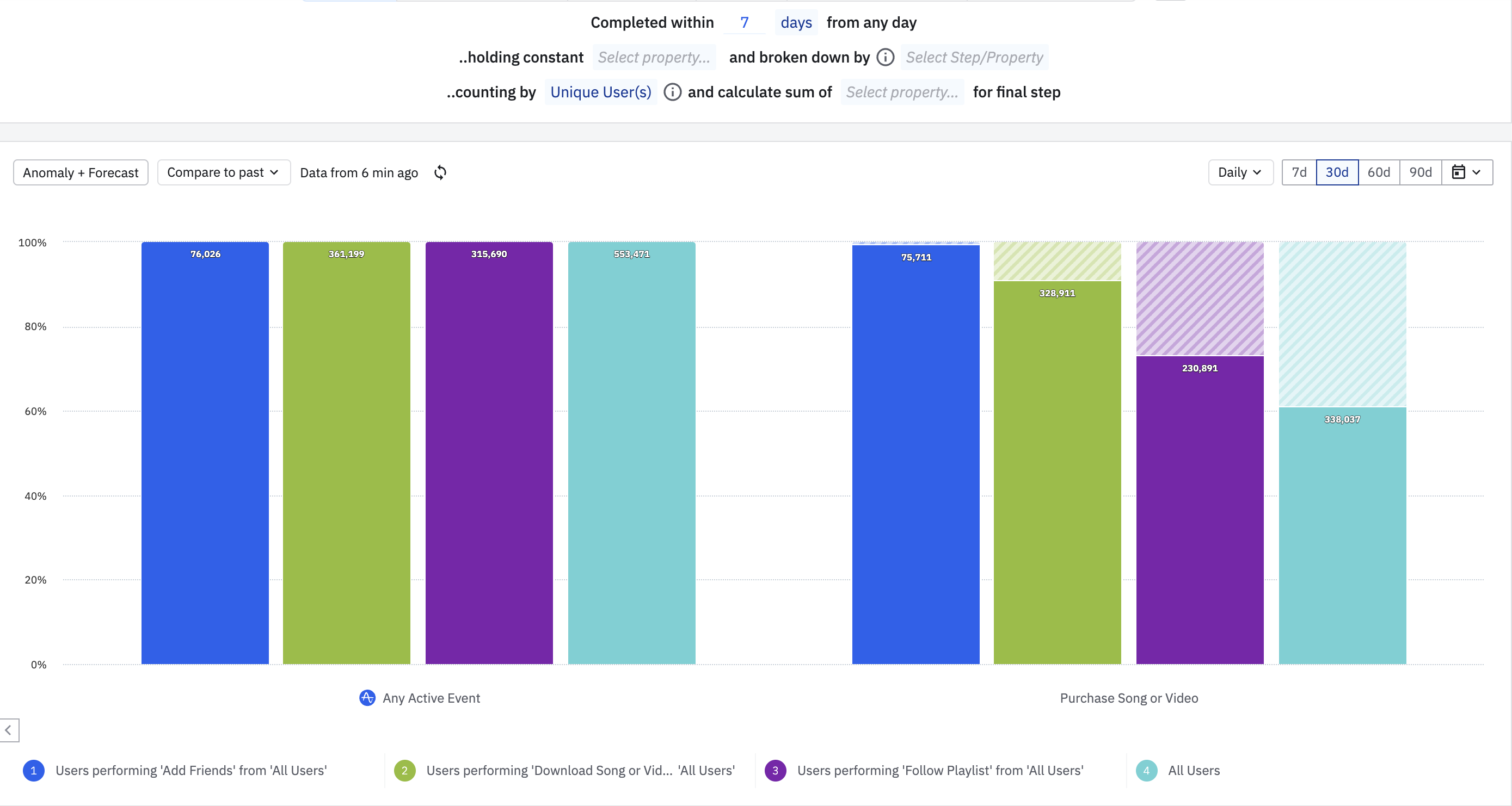 Any Event -> Purchase Song or Video 퍼널만 비교했는데, 중간에 다른 이벤트도 한 번 추가해보겠습니다.