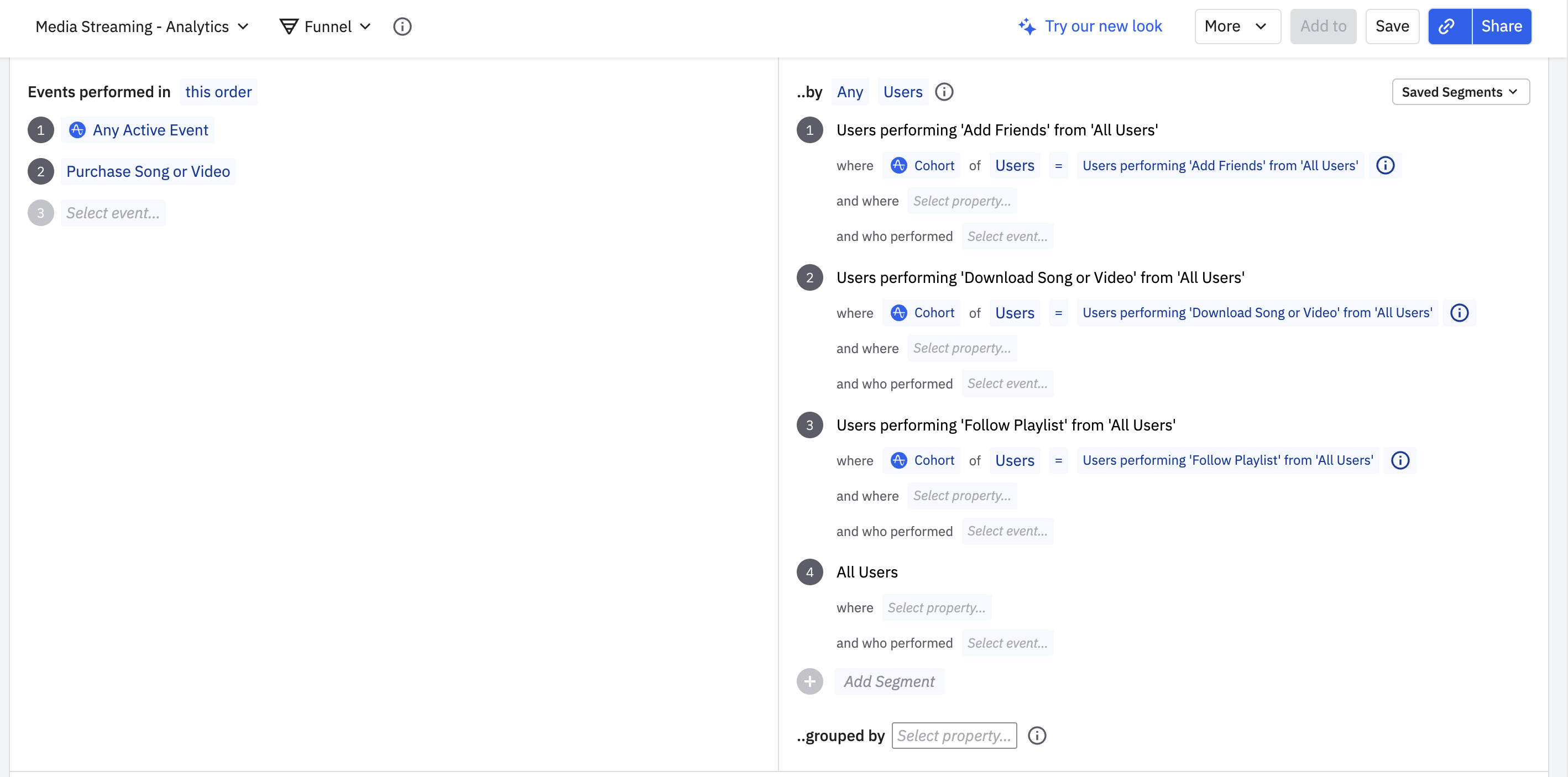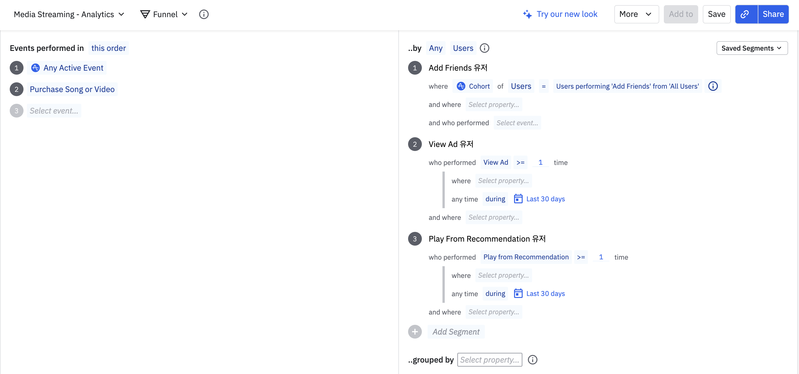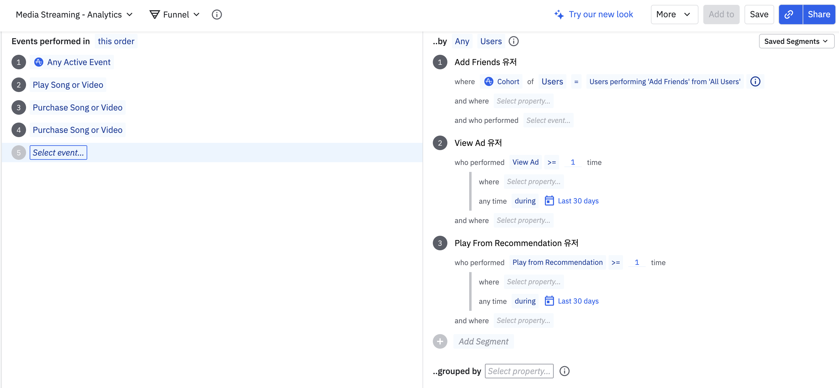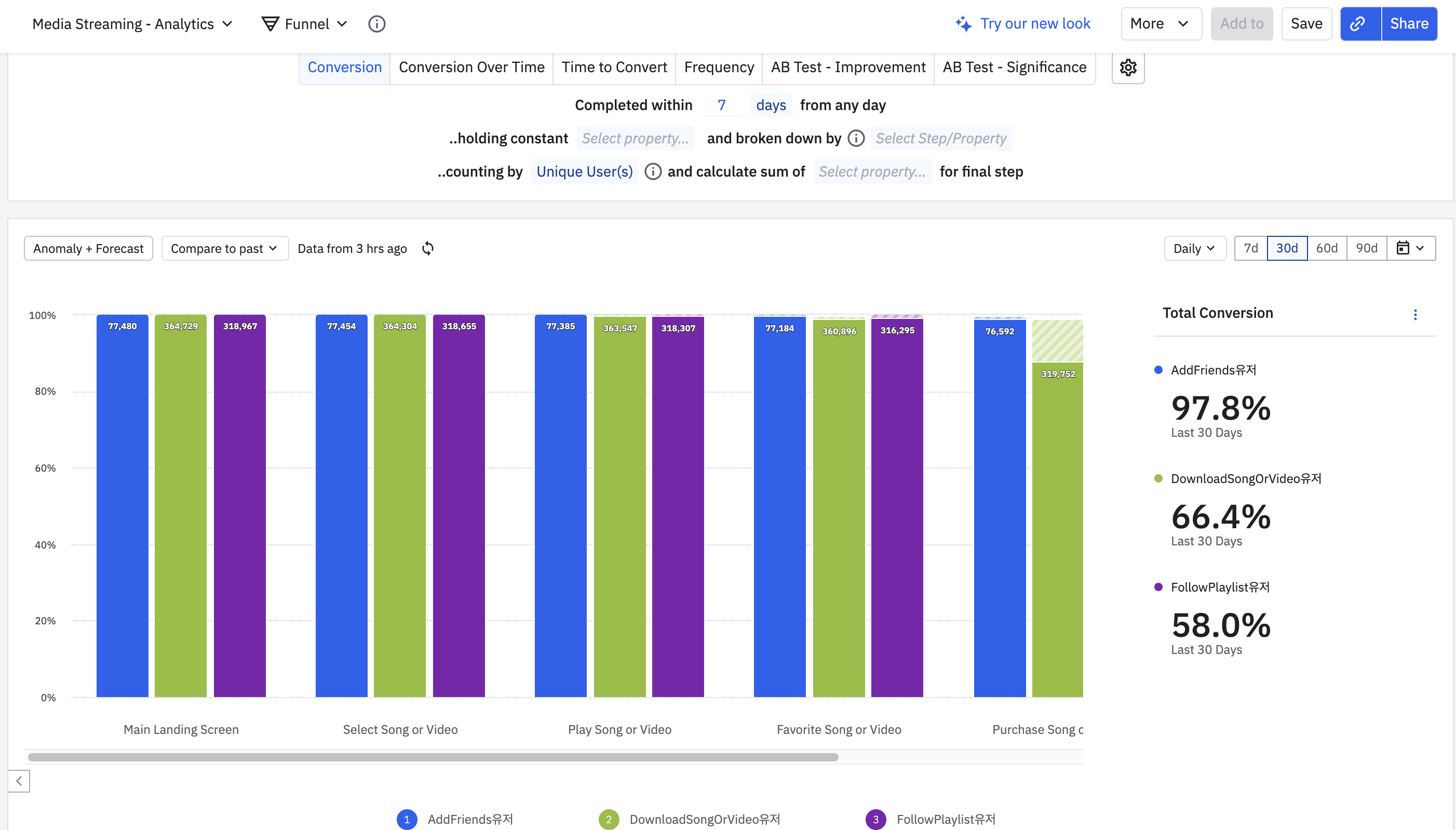 Any Event -> Purchase Song or Video 퍼널만 비교했는데, 중간에 다른 이벤트도 한 번 추가해보겠습니다.