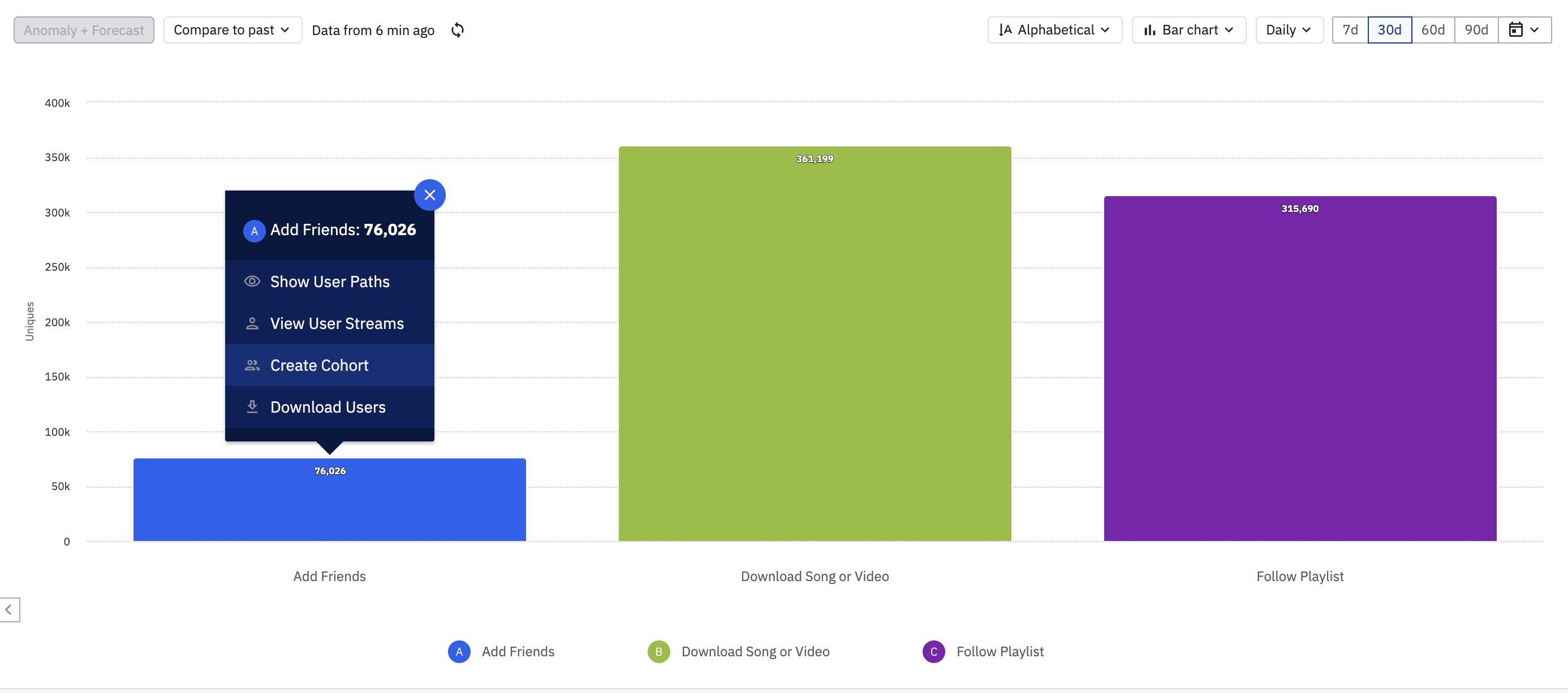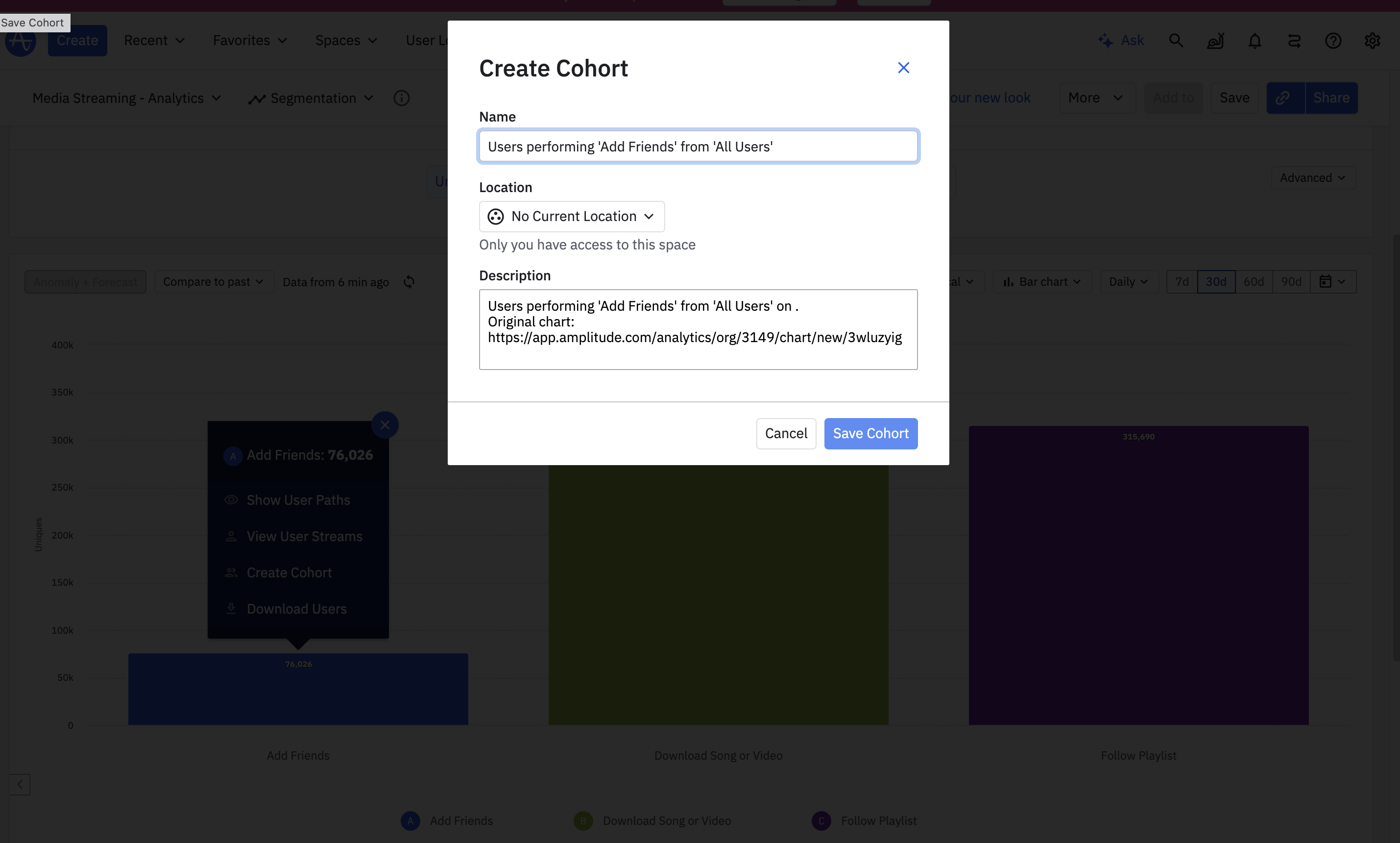 우선 위의 이벤트별 유저를 코호트로 바로 저장해주기 위해 bar chart 에서 Create Cohort 해줍니다.