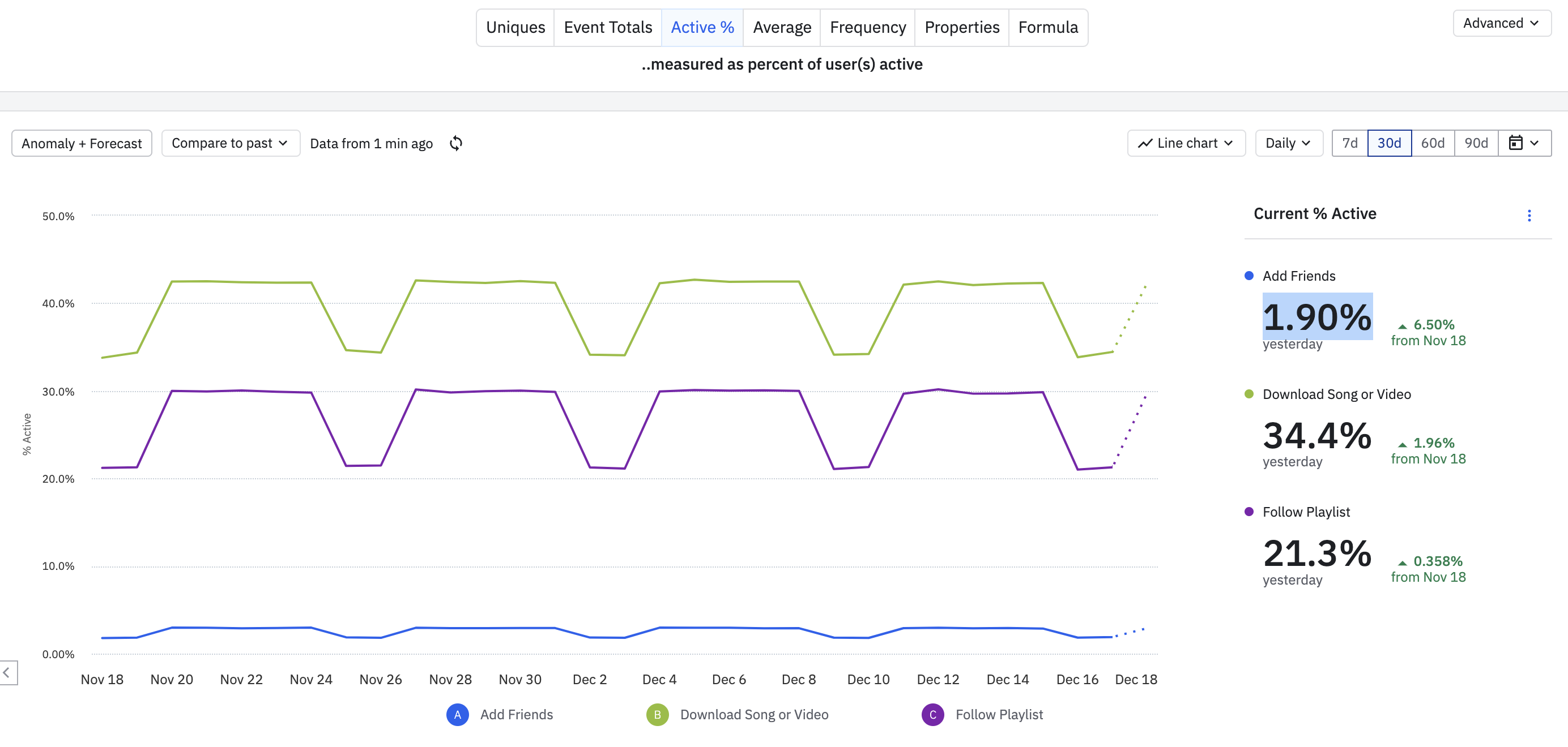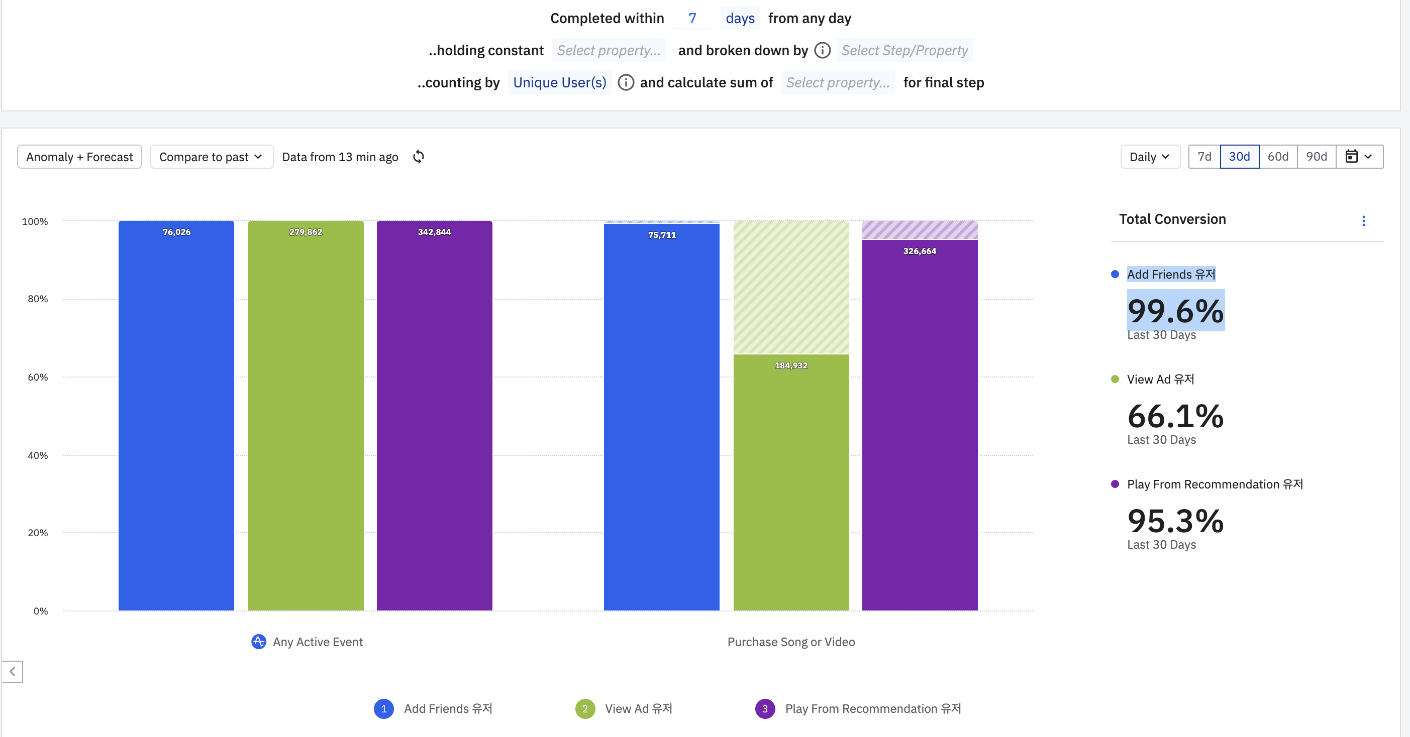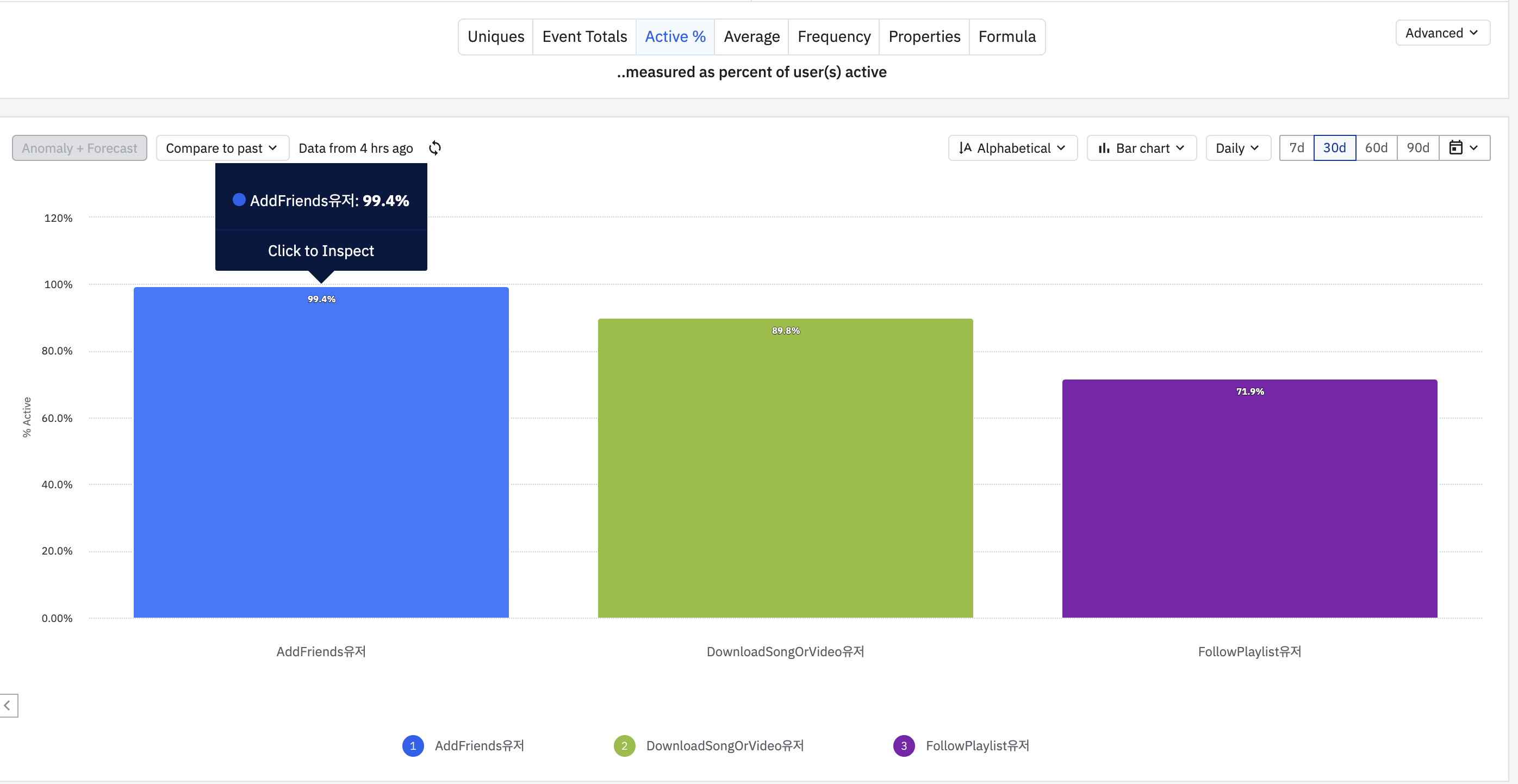 Add Friends,Download Song or Video,Follow Playlist를 각각 이벤트로 지정하여 Active%로 전체대비비율을 확인합니다.