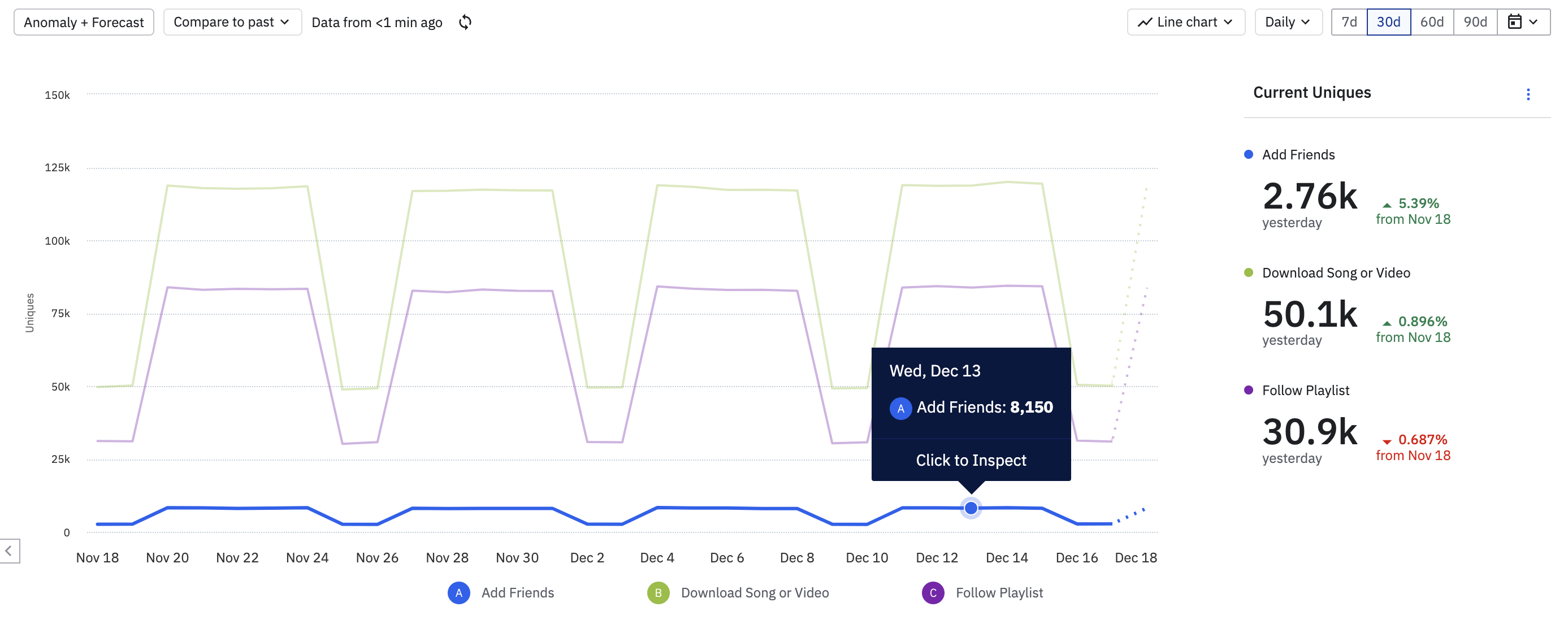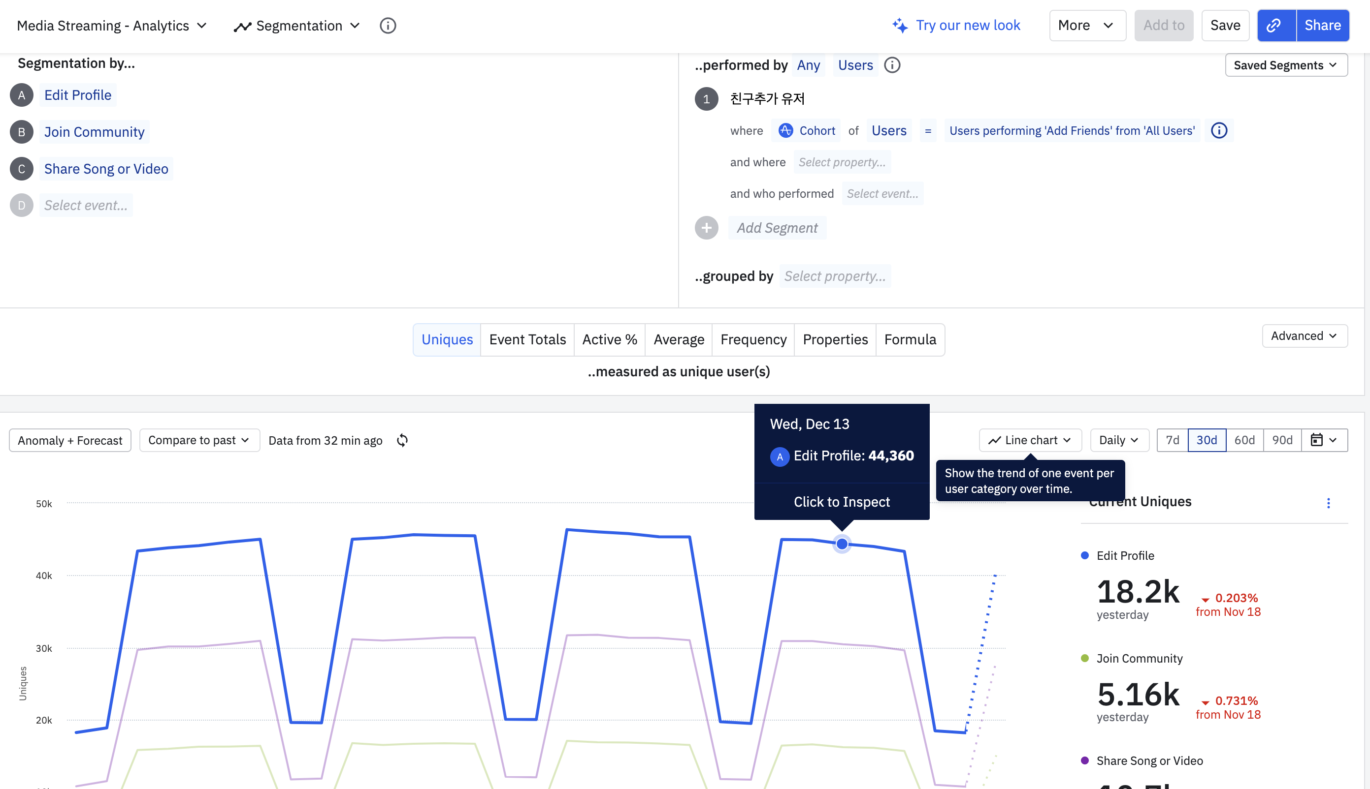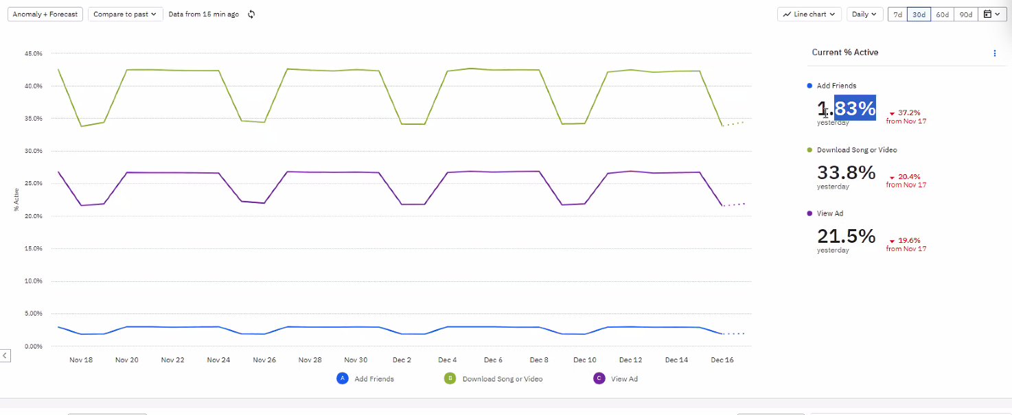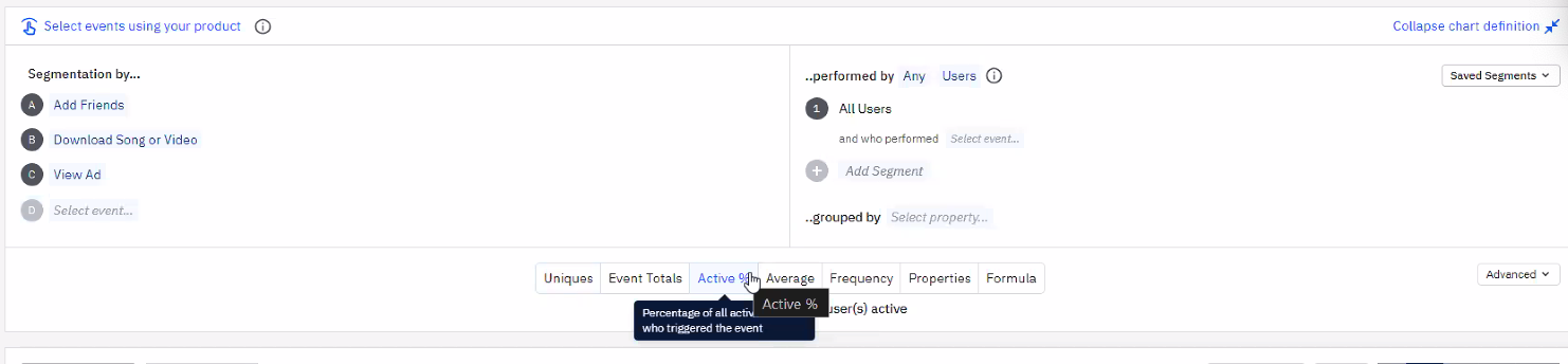 Add Friends,Download Song or Video,Follow Playlist를 각각 이벤트로 지정하여 Active%로 전체대비비율을 확인합니다.