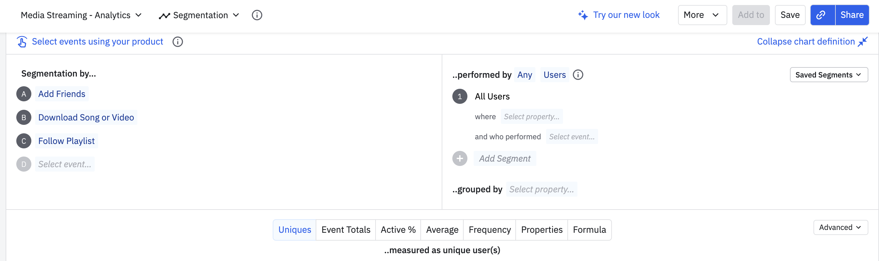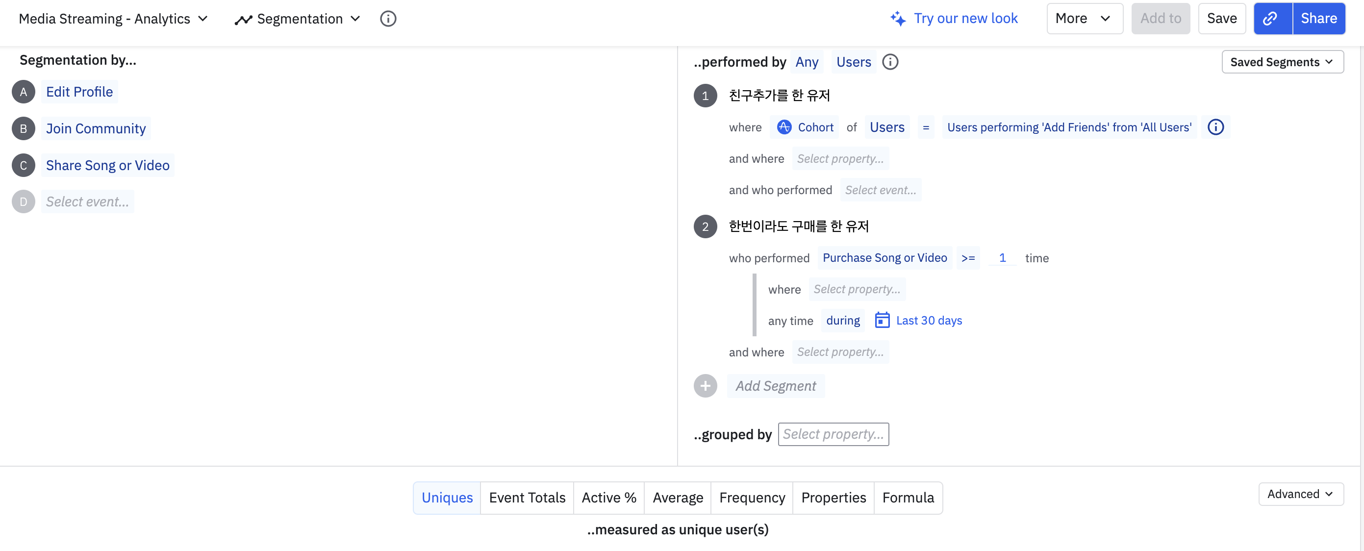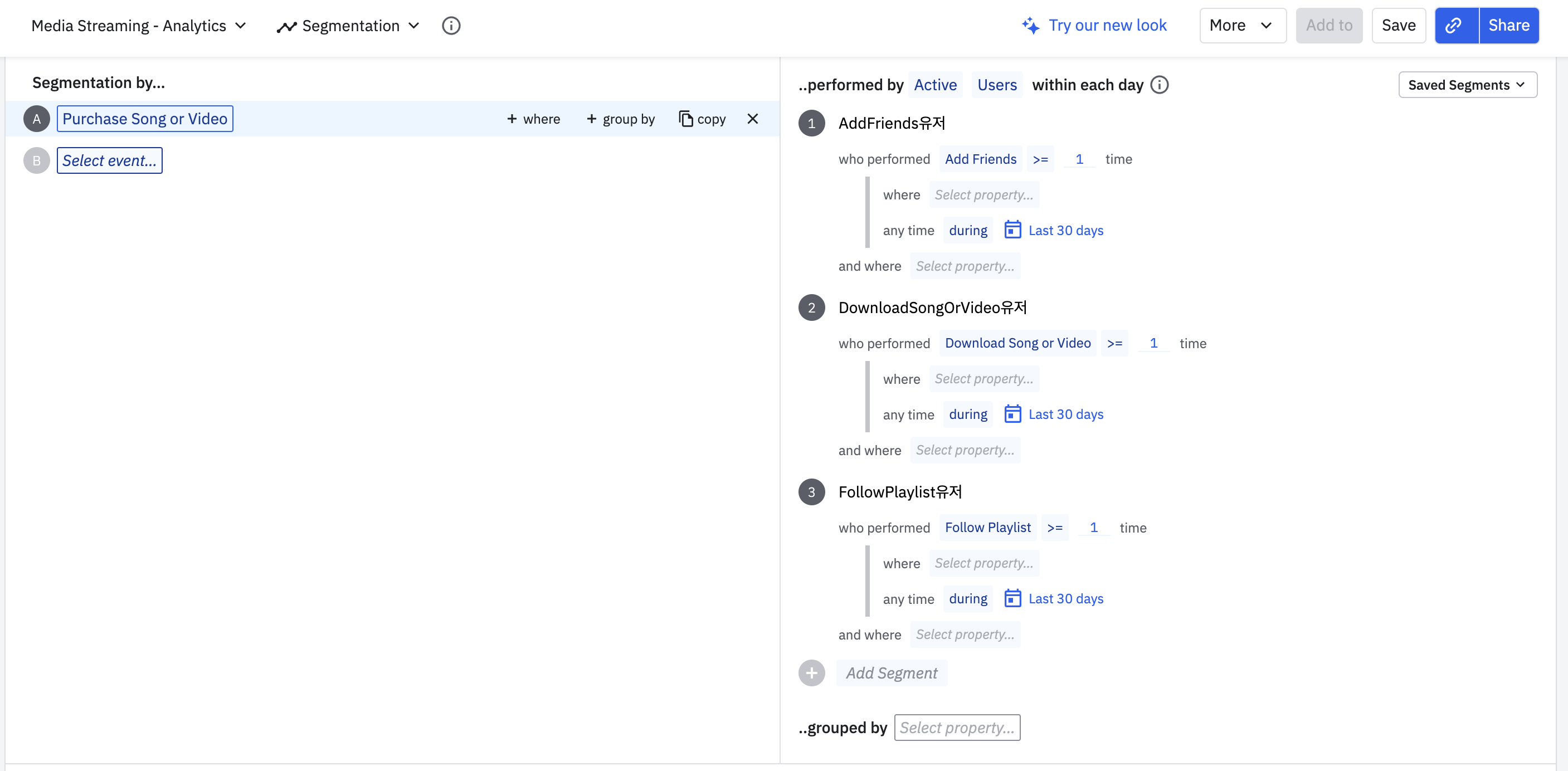 Purchase Song or Video(Any Active Event할경우 모두 100%로 나옴)Chart : Segmentation