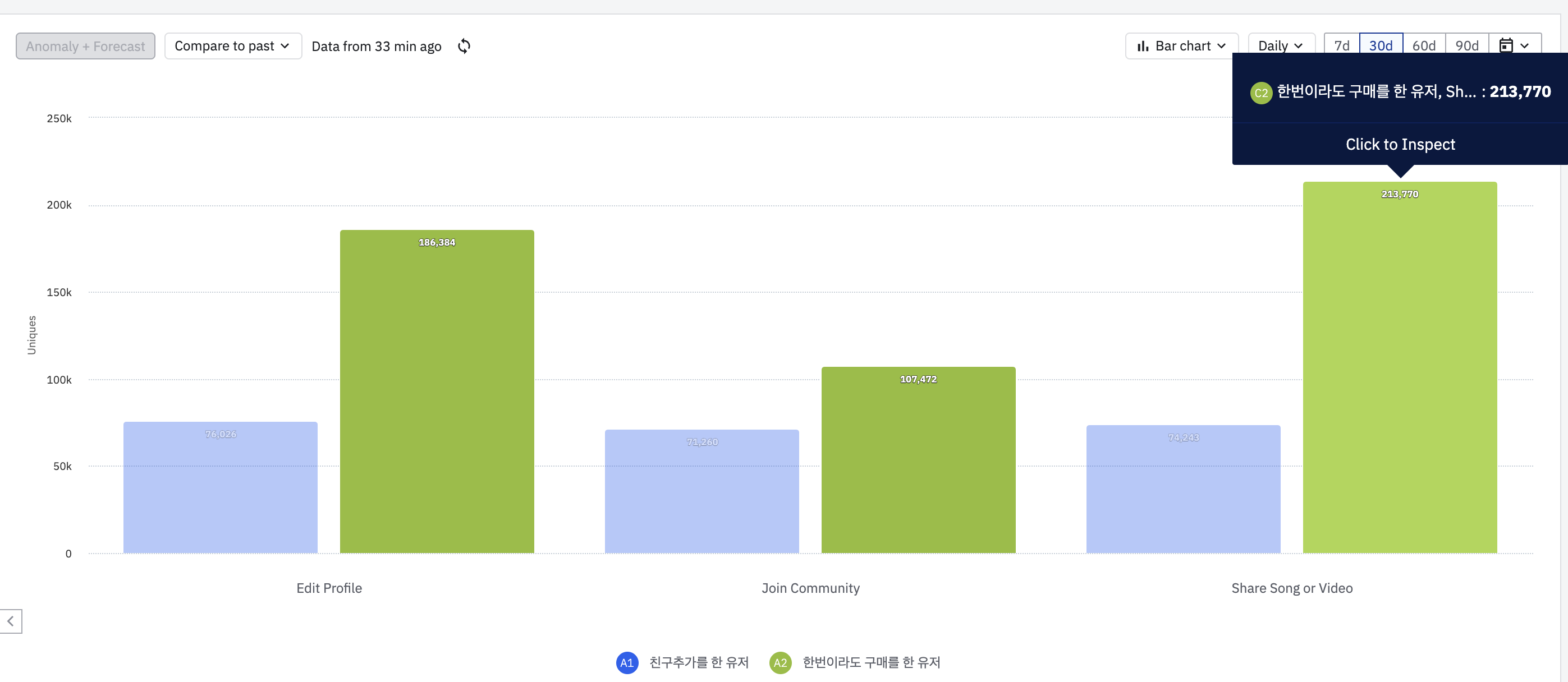 이제 위의 3가지 (친구추가 / 다운로드 / 팔로우) 를 각각의 코호트로 저장하여, 각 이벤트를 한 유저별로 얼마나 구매하는지 확인하겠습니다.