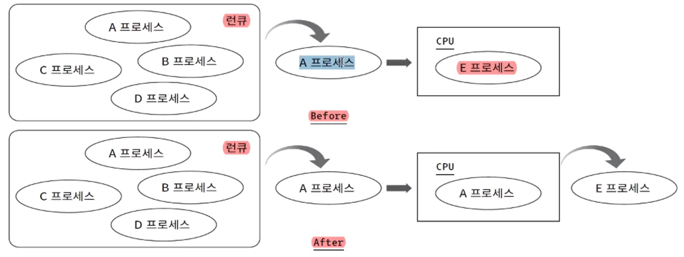 - CPU에서 실행 중인 E 프로세스의 실행 정보로 채워져 있는 CPU레지스터 Set를 비운다.