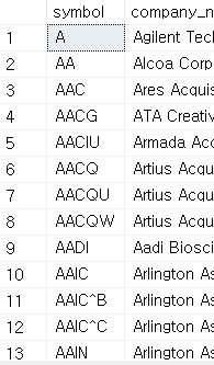 select * from nasdaq_company where symbol like 'A_' -- A + 어떤 문자