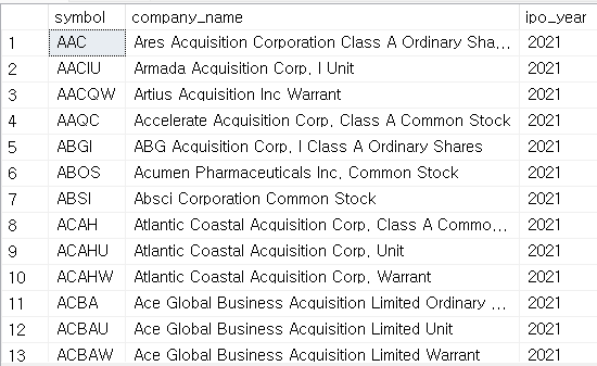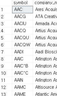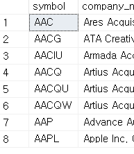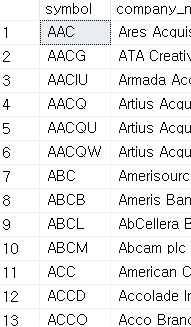 select * from nasdaq_company where symbol like 'A_C%' -- A + 어떤 문자 + C