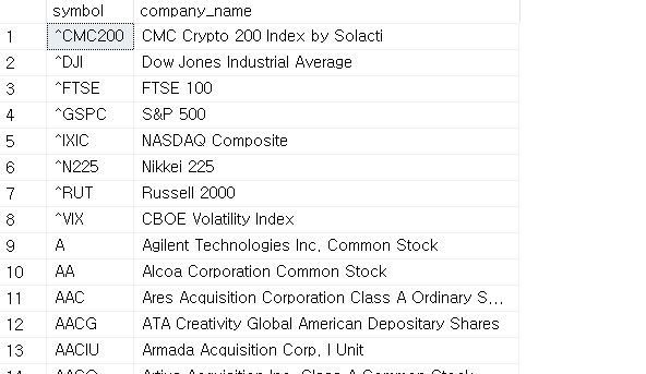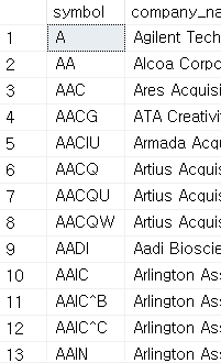 select * from nasdaq_company where symbol like 'A%' -- A + 어떤 문자열