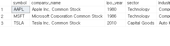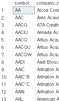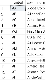 select * from nasdaq_company where symbol like 'AA%' -- AA + 어떤 문자열