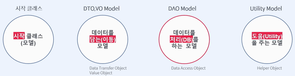 데이터 베이스에 데이터(VO, DTO)를 저장, 수정하거나 검색, 삭제를 하기 위해서 만들어지는 모델(클래스)