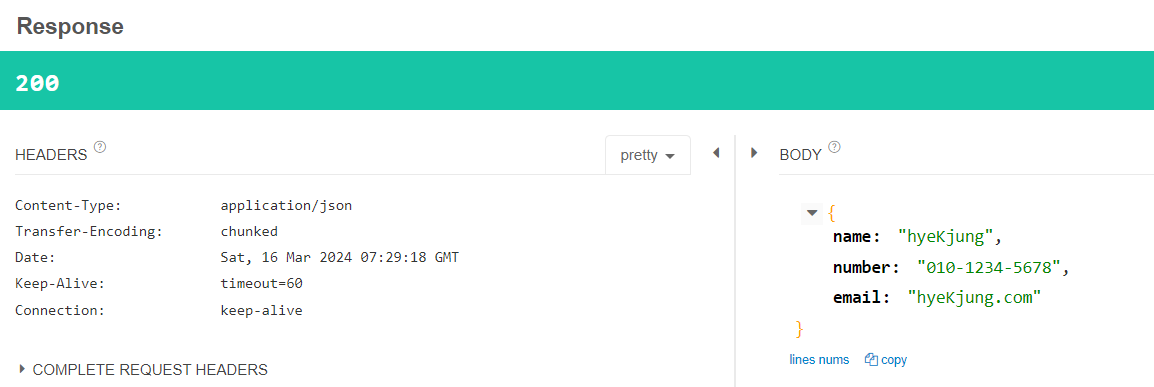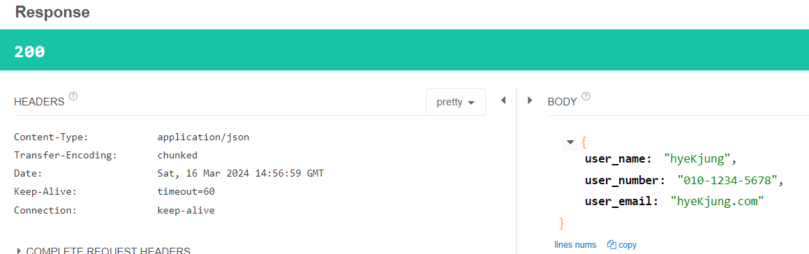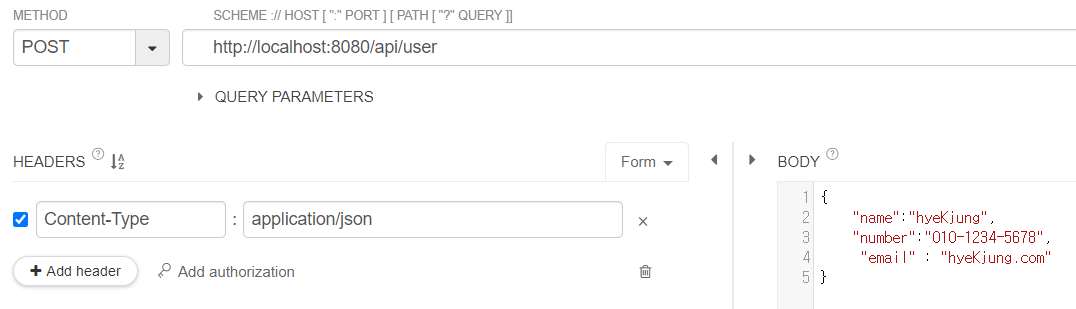 Json 형태로 BODY에 데이터를 보내었고, 잘 받아와지는 것을 확인할 수 있다.