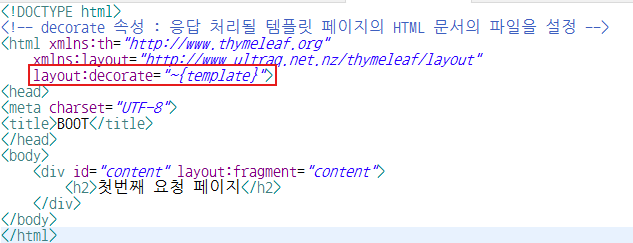 Tymeleaf 사용 : HTML 문서에 th 네임스페이스를 추가해야만 사용 가능