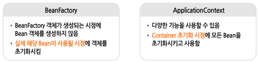 * BeanFactory : BeanFactory 객체를 생성할 때 환경설정파일을 제공받아 BeanFactory 객체 초기화 처리