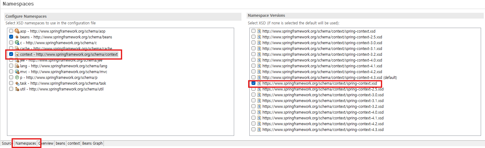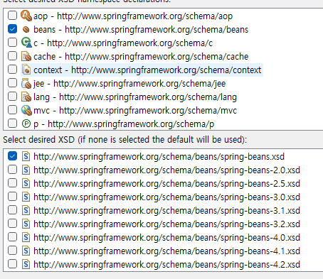- 스키마 파일 선택 - beans 엘리먼트(기본 Name Spaces) 사용