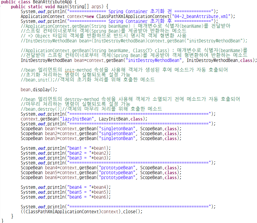 ③ lazy-init 속성 : false(기본값) 또는 true 중 하나를 속성값으로 설정(false : 스프링 컨테이너가 초기화될 때 객체를 미리 생성, true : 미리 생성하지 않고 getBean() 메소드를 호출할 때 객체 생성)