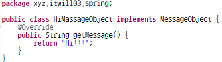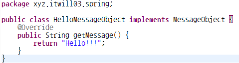 2. HelloMessageObject : MassageObject 인터페이스를 상속받아 메소드 오버라이드, "Hello!!!" 메세지 반환(return)