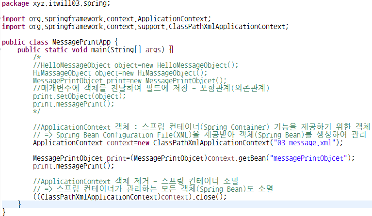 📍기존 new 연산자로 객체를 생성하면 출력 내용을 변경하기 위해 "Hi!!!" 메세지를 반환하는 객체를 가진 클래스로 연관되어 있는 클래스를 전부 변경해줘야하는 불편함이 있음 → 해결법 : spring container 이용, 프로그램을 수정하지 않고 XML만 변경하여 관계 수정 가능(setter 메소드 호출 필요 X, 객체 간의 관계를 맺을 필요 X)