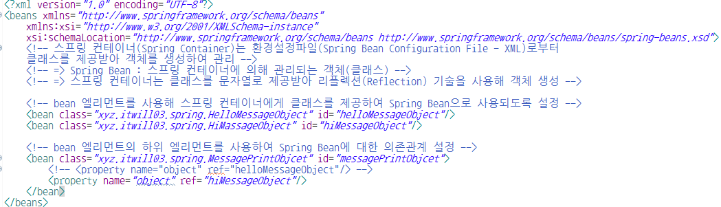 - bean 엘리먼트 : 스프링 컨테이너에게 클래스를 제공하여 Spring Bean으로 사용되도록 설정하는 엘리먼트 / 하위 엘리먼트를 사용하여 Spring Bean에 대한 의존관계 설정