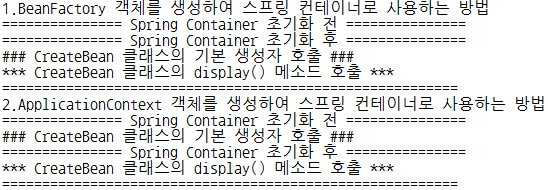=> 설명 : BeanFactory 객체는 환경설정파일을 읽어드린 후 바로 객체를 생성하지 않고 객체를 사용하기 위해 제공을 요청한 경우에 객체를 생성하여 제공한다. 그에 반해 ApplicationContext 객체는 환경설정파일을 읽어드림과 동시에 미리 객체를 생성하여 만들어진 객체(스프링 컨테이너가 관리하는 객체)를 검색하여 사용
