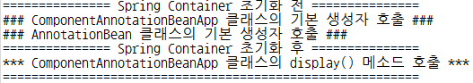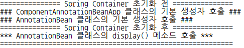 => 설명 : ApplicationContext 객체를 이용해 환경설정파일을 읽어 드렸기 때문에 객체가 미리 만들어지고 InitDestroyMethodBean 클래스에 오버라이드된 메소드도 호출됨. 환경설정파일에 bean 엘리먼트의 init-method 속성으로 객체 생성 후 init() 메소드가 자동호출됨.