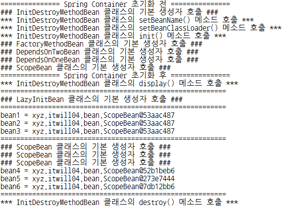 => 설명 : LazyInitBean을 제외한 모든 객체가 미리 생성됨. 하지만 LazyInitBean 객체는 lazy-init 속성이 true이므로 객체를 사용할 때 생성됨.