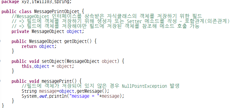 3. MessagePrintObjcet : MessageObjcet 인터페이스를 상속받은 자식클래스의 객체를 저장하기 위한 필드 작성 - 필드에 객체를 저장하기 위해 생성자 또는 Setter 메소드 작성(의존관계)