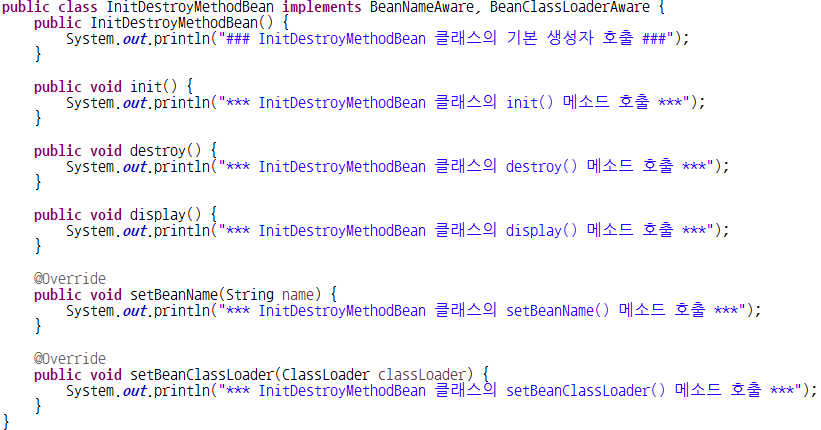 10. InitDestroyMethodBean : 스프링 컨테이너에 의해 관리될 클래스(Spring Bean)는 다양한 인터페이스를 상속받아 추상메소드 오버라이드 선언 가능