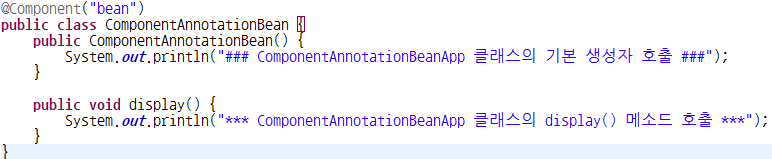 => 설명 : 부트에선 xml을 사용하지 않기 때문에 무조건 어노테이션을 이용. 어노테이션의 번거로움을 해결하기 위해 @Component(value="")을 이용. 기본생성자와 메소드가 작성된 클래스를 어노테이션을 이용해 Spring Bean으로 등록.