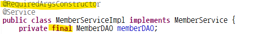 @RequiredArgsConstructor : final 제한자를 사용한 필드에 대한 초기화 작업을 실행할 수 있는 매개변수가 작성된 생성자를 제공하는 어노테이션