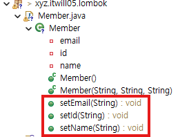 @Setter : 클래스에 작성된 모든 필드에 대한 Setter 메소드를 제공하기 위한 어노테이션