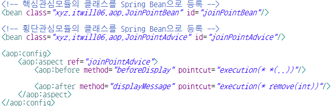 ➡️설명 : Spring Bean Configuration File(xml 파일)에 핵심, 횡단관심모듈의 클래스를 Spring Bean으로 등록하고 AOP 기능을 사용하기 위해 aop:config 엘리먼트 추가.