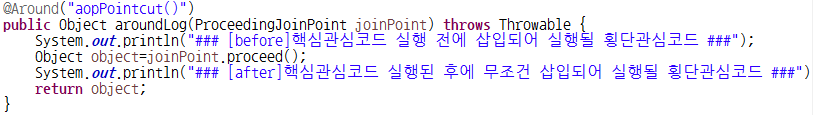 - 반환형은 무조건 Object 객체, 매개변수는ProceedingJoinPoint라는 인터페이스로 지정