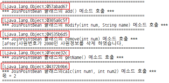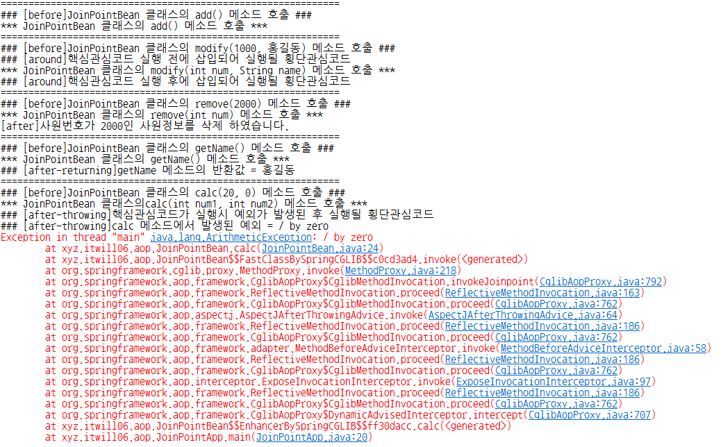 ➡️설명 : 최종 JoinPointApp 출력 콘솔, 일부러 예외를 발새이켜 after-throwing 출력
