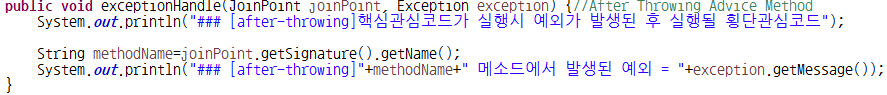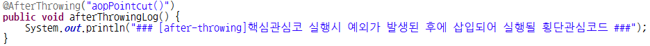 @AfterThrowing : 타겟메소드의 명령(핵심관심코드)이 실행시 예외가 발생된 후에 삽입되어 실행될 횡단관심코드를 제공하기 위한 어노테이션