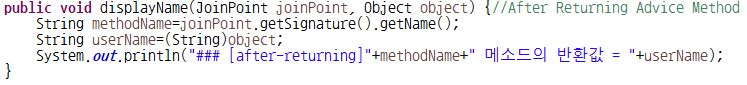 - After Returning Advice Method에 Object 클래스의 매개변수를 작성한 경우 Spring Bean Configuration File의 AOP 설정에서 after-returning 엘리먼트에 returning 속성을 반드시 작성해 타겟메소드의 반환값이 매개변수에 저장되도록 설정