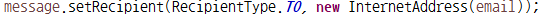 - MimeMessage.setRecipient(RecipientType type, Address address) or .setRecipients(RecipientType type, Address[] address) : MimeMessage 객체의 메일을 받는 사람 or 사람들의 이메일 주소 관련 정보를 변경하는 메소드